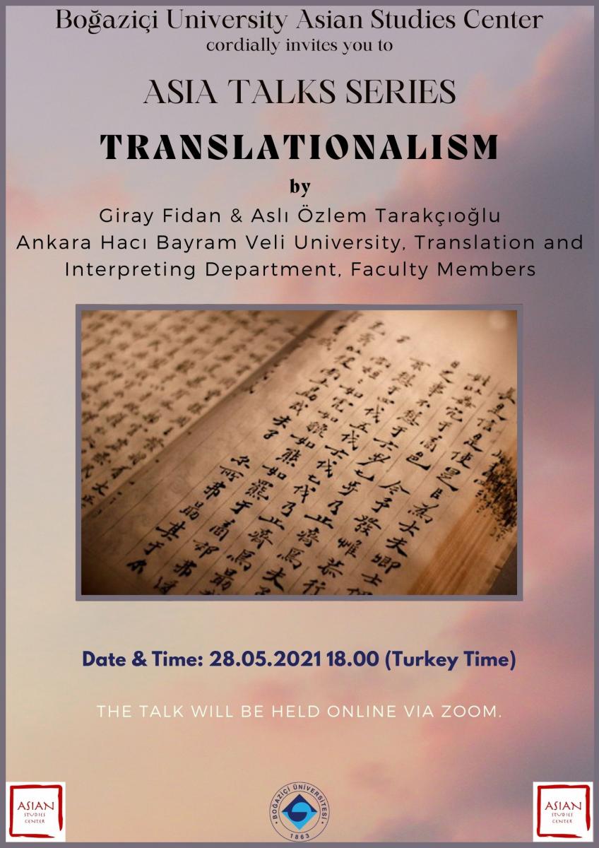 Boğaziçi Üniversitesi Asya Çalışmaları Merkezi, 28 Mayıs saat 18.00'de (Türkiye saati ile) Prof. Giray Fidan ve Dr. Aslı Özlem Tarakçıoğlu tarafından Çevirizm konulu bir söyleşi gerçekleştiriyor.