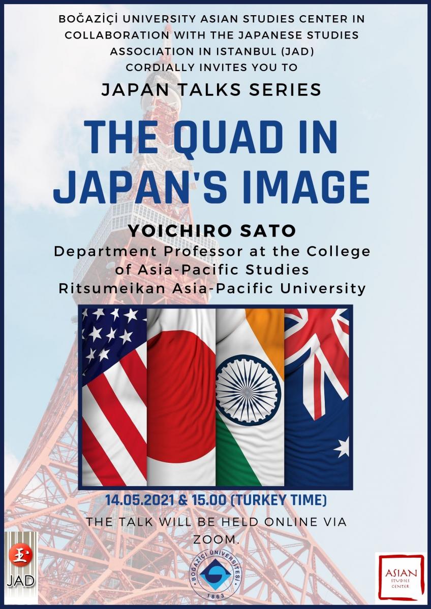 Boğaziçi Üniversitesi Asya Araştırmaları Merkezi, Japon Araştırmaları Derneği (JAD) işbirliğiyle İstanbul'da, 14 Mayıs günü saat 15.00'te (Türkiye saati ile) Prof. Yoichiro Sato tarafından verilecek "The QUAD in Japan's Image" konulu bir söyleşi gerçekleştiriyor.