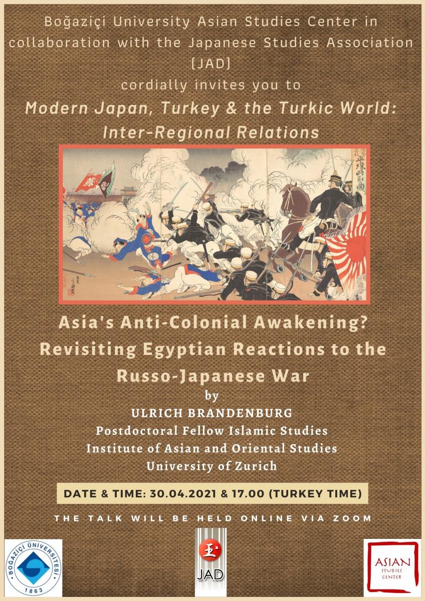 Boğaziçi Üniversitesi Asya Araştırmaları Merkezi, Japon Araştırmaları Derneği (JAD) işbirliğiyle İstanbul'da 30 Nisan saat 17.00'de Dr. Ulrich Brandenburg tarafından "Modern Japonya, Türkiye ve Türk Dünyası: Avrasya'da Bölgeler Arası İlişkiler Dizisi: Asya'nın Sömürge Karşıtı Uyanışı? Rus-Japon Savaşı'na Mısır'ın Tepkilerini Yeniden İncelemek" konuları çerçevesinde söyleşi gerçekleştiriyor.
